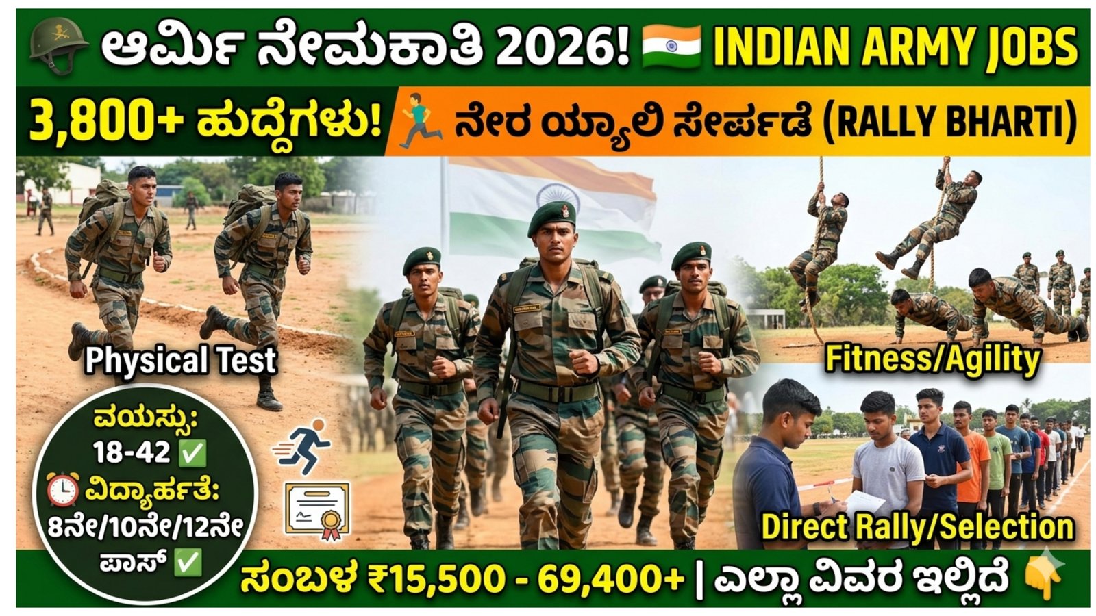 Army ಆರ್ಮಿ ನೇಮಕಾತಿ 2026: 3,800+ ಹುದ್ದೆಗಳು – ಅರ್ಹತೆ, ವೇತನ, ರ್ಯಾಲಿ ಮಾಹಿತಿ ಸಂಪೂರ್ಣ ವಿವರ