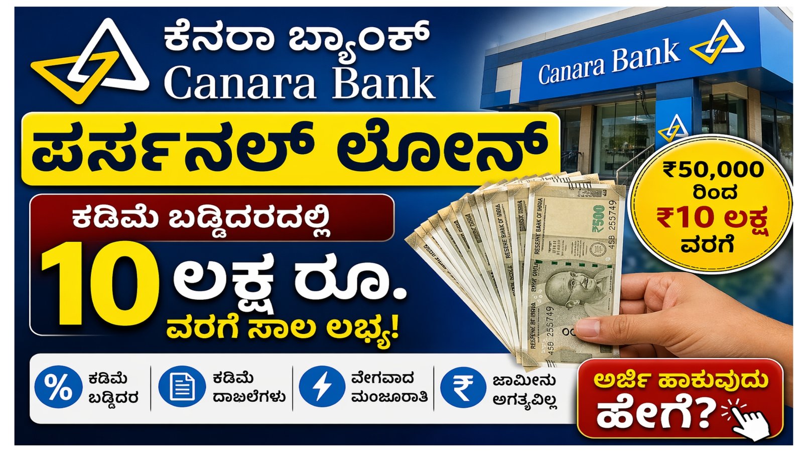 Canara Bank ಭಾರತದ ವಿಶ್ವಾಸಾರ್ಹ ಸರ್ಕಾರಿ ಬ್ಯಾಂಕುಗಳಲ್ಲಿ ಪ್ರಮುಖ ಸ್ಥಾನ ಪಡೆದಿರುವ Canara Bank ಈಗ ತನ್ನ ಗ್ರಾಹಕರಿಗೆ ವೇಗವಾದ ಮತ್ತು ಸುಲಭ ಪರ್ಸನಲ್ ಲೋನ್ ಸೌಲಭ್ಯವನ್ನು ಒದಗಿಸುತ್ತಿದೆ. ತುರ್ತು ಹಣಕಾಸು ಅಗತ್ಯಗಳನ್ನು ಎದುರಿಸುವವರಿಗೆ ಇದು ಉತ್ತಮ ಪರಿಹಾರವಾಗಿ ಪರಿಣಮಿಸುತ್ತಿದೆ.