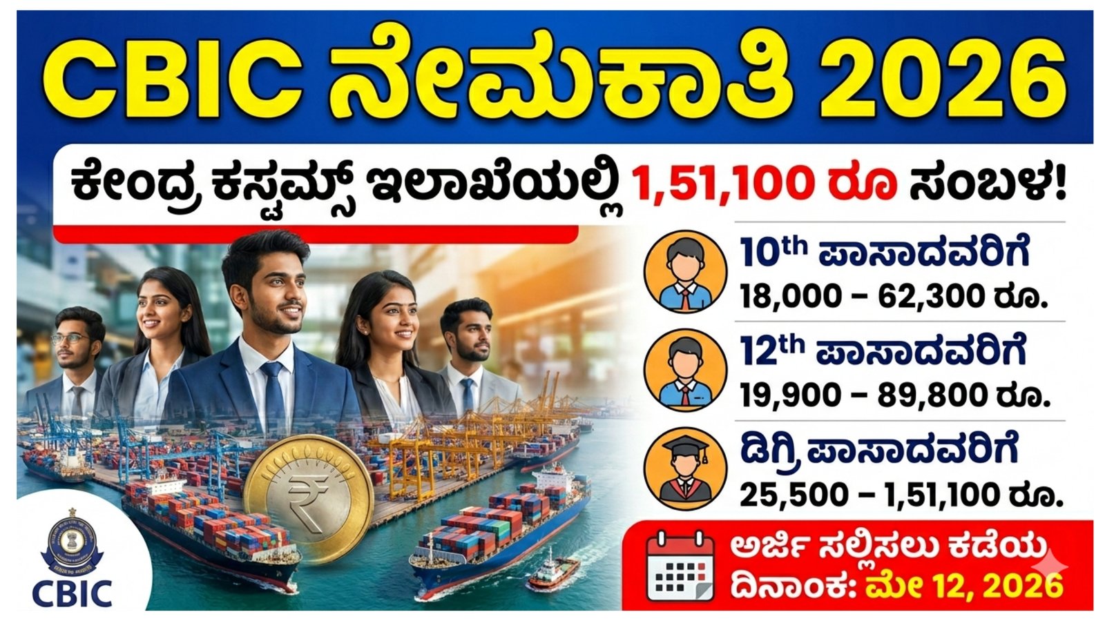 CBIC ನೇಮಕಾತಿ 2026: 10ನೇ, 12ನೇ, ಡಿಗ್ರಿ ಪಾಸಾದವರಿಗೆ ಕೇಂದ್ರ ಸರ್ಕಾರದ ಉದ್ಯೋಗ ಅವಕಾಶ