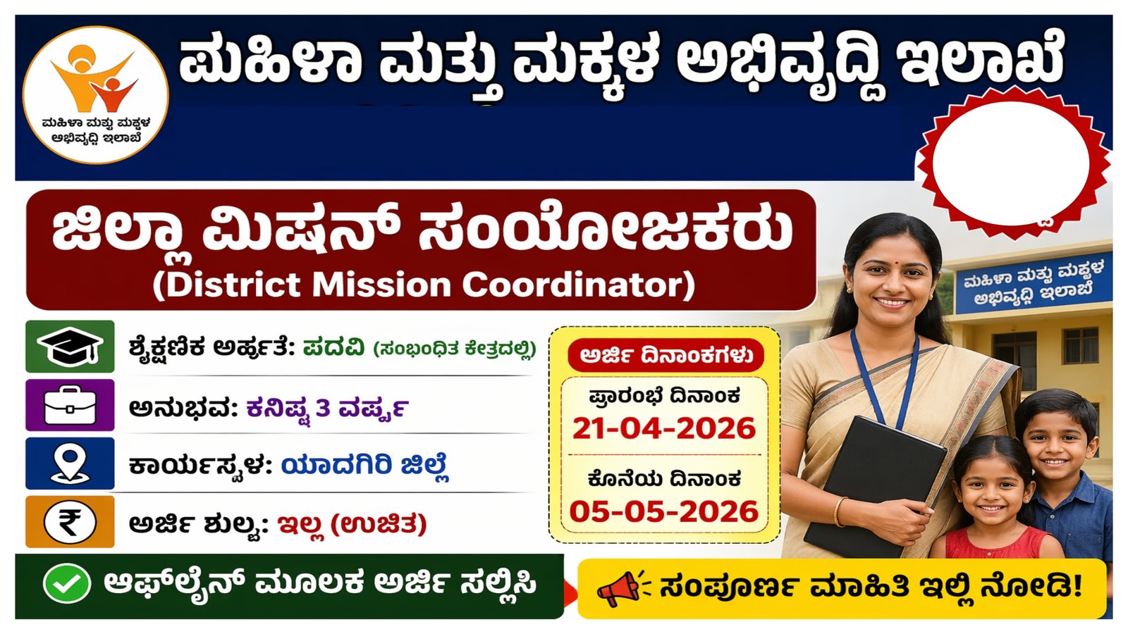 DWCD ಕರ್ನಾಟಕ ಸರ್ಕಾರದ ಮಹಿಳಾ ಮತ್ತು ಮಕ್ಕಳ ಅಭಿವೃದ್ಧಿ ಇಲಾಖೆ (DWCD) ವತಿಯಿಂದ ಯಾದಗಿರಿ ಜಿಲ್ಲೆಯಲ್ಲಿ ಜಿಲ್ಲಾ ಮಿಷನ್ ಸಂಯೋಜಕರ (District Mission Coordinator) ಹುದ್ದೆಗೆ ನೇಮಕಾತಿ ಪ್ರಕ್ರಿಯೆ ಆರಂಭವಾಗಿದೆ. ಸಮಾಜ ಸೇವೆ, ಆರೋಗ್ಯ ನಿರ್ವಹಣೆ ಹಾಗೂ ಗ್ರಾಮೀಣ ಅಭಿವೃದ್ಧಿ ಕ್ಷೇತ್ರದಲ್ಲಿ ಕೆಲಸ ಮಾಡಲು ಆಸಕ್ತಿ ಇರುವವರಿಗೆ ಇದು ಉತ್ತಮ ಅವಕಾಶವಾಗಿದೆ.