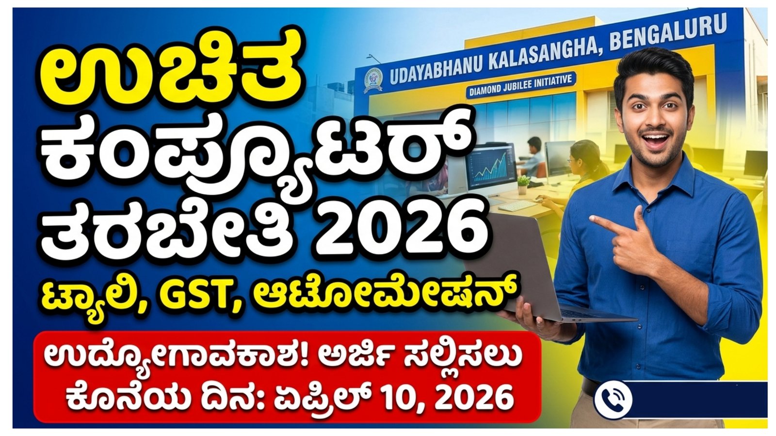 ಇದನ್ನು ಮನಗಂಡು, ಬೆಂಗಳೂರಿನ ಪ್ರಸಿದ್ಧ ಸಾಂಸ್ಕೃತಿಕ ಸಂಸ್ಥೆಯಾದ ಉದಯಭಾನು ಕಲಾಸಂಘವು ತನ್ನ ವಜ್ರಮಹೋತ್ಸವದ ಅಂಗವಾಗಿ ಯುವಕರಿಗೆ ಸಂಪೂರ್ಣ ಉಚಿತ ಕಂಪ್ಯೂಟರ್ ತರಬೇತಿ ಕಾರ್ಯಕ್ರಮವನ್ನು ಪ್ರಾರಂಭಿಸಿದೆ. ಈ ಕಾರ್ಯಕ್ರಮದ ಮೂಲಕ ಸಾವಿರಾರು ರೂಪಾಯಿ ಖರ್ಚು ಮಾಡದೇ, ನೀವು ಉದ್ಯೋಗಕ್ಕೆ ಅಗತ್ಯವಾದ ಕೌಶಲ್ಯಗಳನ್ನು ಕಲಿಯಬಹುದು.