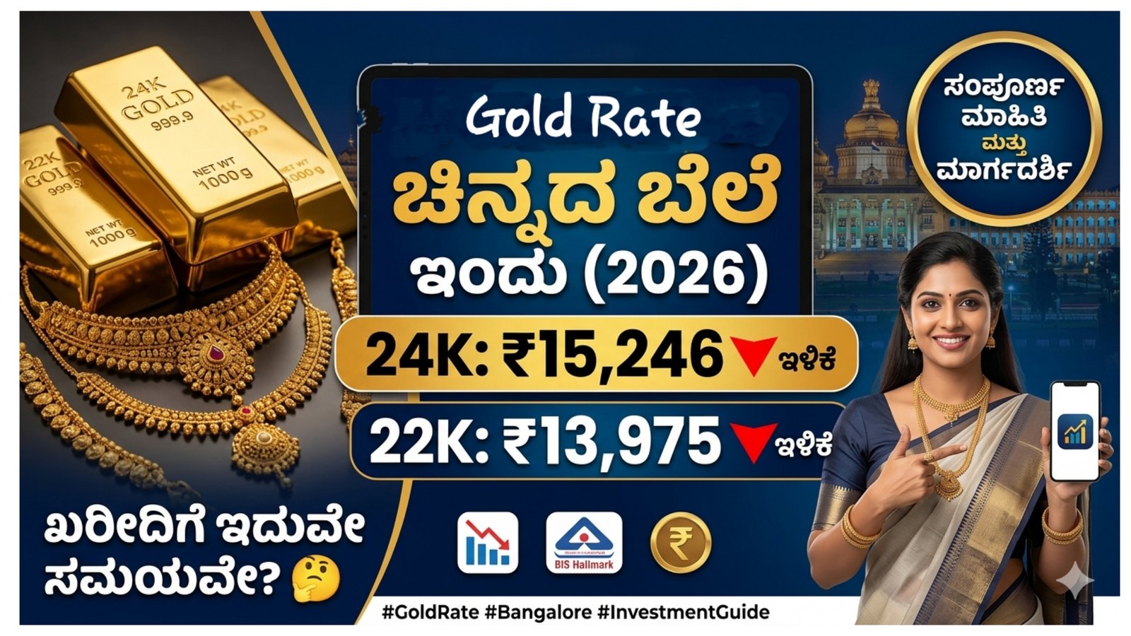 ಬೆಂಗಳೂರುದಲ್ಲಿ ಇಂದಿನ ಚಿನ್ನದ ದರದಲ್ಲಿ ಸ್ವಲ್ಪ ಇಳಿಕೆ ಕಂಡುಬಂದಿದ್ದು, ಖರೀದಿ ಮಾಡಲು ಇದು ಒಳ್ಳೆಯ ಸಮಯವಾಗಬಹುದು. ಆದರೆ, ಹೂಡಿಕೆ ಮಾಡುವ ಮೊದಲು ಮಾರುಕಟ್ಟೆ ಸ್ಥಿತಿ, ಭವಿಷ್ಯದ ಟ್ರೆಂಡ್ ಮತ್ತು ನಿಮ್ಮ ಆರ್ಥಿಕ ಪರಿಸ್ಥಿತಿಯನ್ನು ಪರಿಶೀಲಿಸುವುದು ಅತ್ಯಂತ ಮುಖ್ಯ.