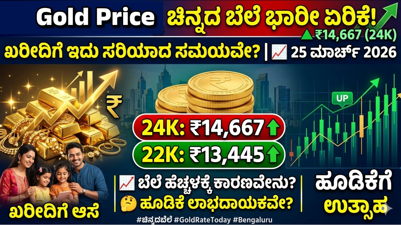 ಇಂದು (25 ಮಾರ್ಚ್ 2026) ಬೆಂಗಳೂರಿನಲ್ಲಿ 24 ಕ್ಯಾರೆಟ್ ಚಿನ್ನದ ದರ ₹14,667 ಪ್ರತಿಗ್ರಾಂ ಆಗಿದ್ದು, ನಿನ್ನೆಗಿಂತ ₹376 ಏರಿಕೆಯಾಗಿದೆ. ಅದೇ ರೀತಿ 22 ಕ್ಯಾರೆಟ್ ಚಿನ್ನ ₹13,445 ಮತ್ತು 18 ಕ್ಯಾರೆಟ್ ಚಿನ್ನ ₹11,001ಕ್ಕೆ ತಲುಪಿದೆ.