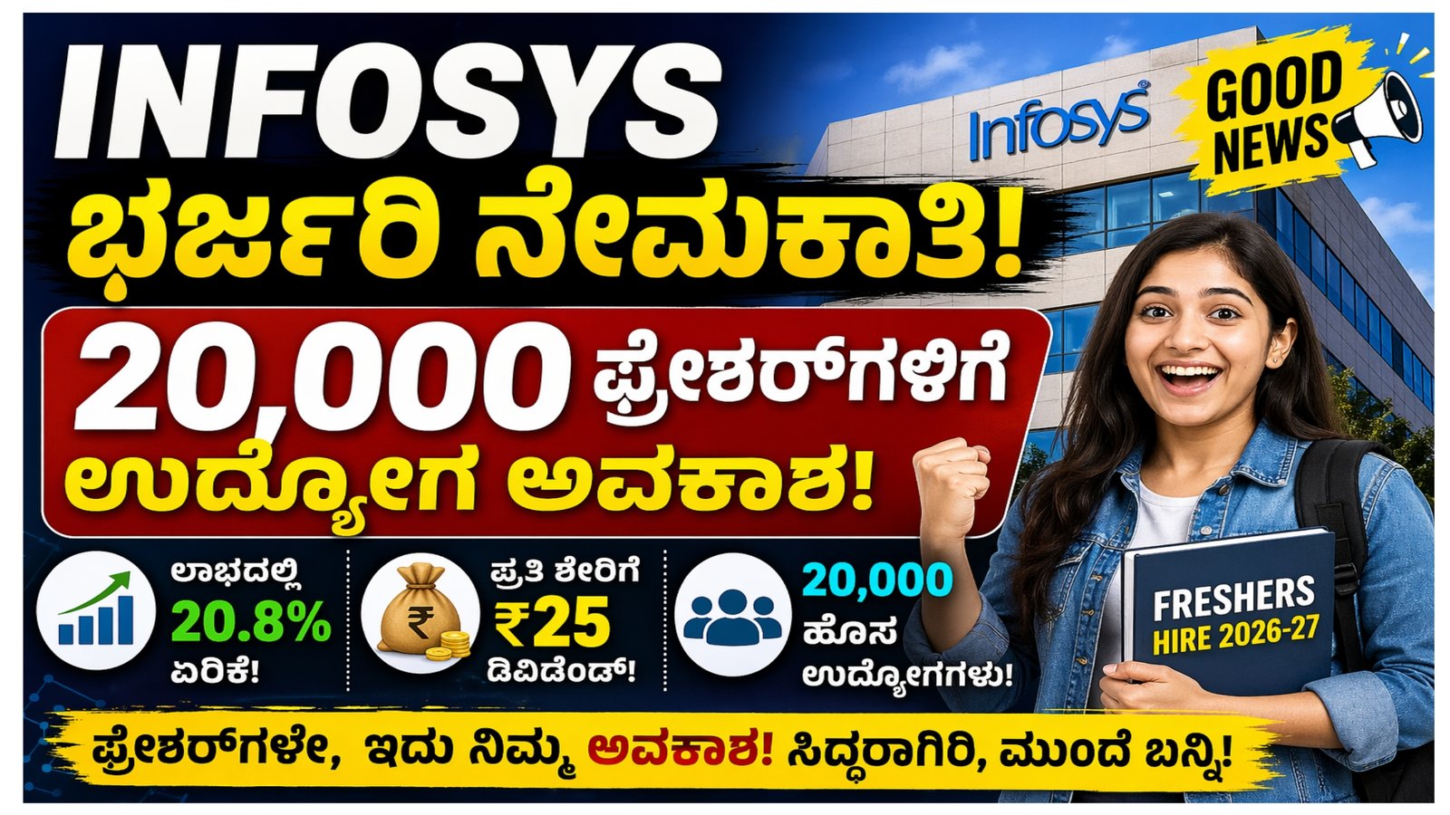 ಭಾರತದ ಐಟಿ ಕ್ಷೇತ್ರದಲ್ಲಿ ಮತ್ತೆ ಚೈತನ್ಯ ಮೂಡಿಸುವಂತಹ ಮಹತ್ವದ ಬೆಳವಣಿಗೆ ನಡೆದಿದೆ. Infosys ಕಂಪನಿ 2026-27ನೇ ಹಣಕಾಸು ವರ್ಷದಲ್ಲಿ ಸುಮಾರು 20,000 ಫ್ರೆಶರ್ಗಳನ್ನು ನೇಮಕಾತಿ ಮಾಡುವ ಯೋಜನೆ ರೂಪಿಸಿದೆ. ಕಳೆದ ಕೆಲವು ವರ್ಷಗಳಿಂದ ‘ಲೇ-ಆಫ್’, ‘ಆರ್ಥಿಕ ಕುಂಠಿತ ಸ್ಥಿತಿ’, ಮತ್ತು Artificial Intelligence ಕಾರಣದಿಂದ ಉದ್ಯೋಗ ಕಳೆದುಕೊಳ್ಳುವ ಭಯದಲ್ಲಿ ಇದ್ದ ಯುವಜನತೆಗೆ ಇದು ದೊಡ್ಡ ಮಟ್ಟದ ನಂಬಿಕೆ ತುಂಬುವ ಸುದ್ದಿ.
