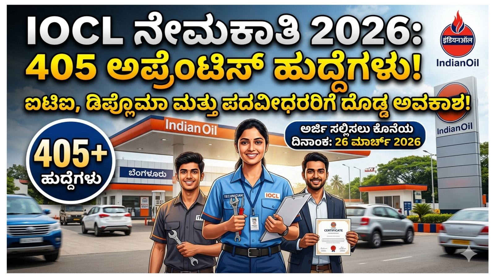 IOCL Recruitment 2026: ಇಂಡಿಯನ್ ಆಯಿಲ್ನಲ್ಲಿ 405 ಅಪ್ರೆಂಟಿಸ್ ಹುದ್ದೆಗಳ ನೇಮಕಾತಿ – ಐಟಿಐ, ಡಿಪ್ಲೊಮಾ ಮತ್ತು ಪದವೀಧರರಿಗೆ ದೊಡ್ಡ ಅವಕಾಶ!