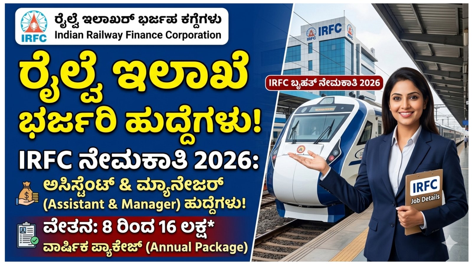ಈ ಲೇಖನದಲ್ಲಿ IRFC Recruitment 2026 ಕುರಿತು ಸಂಪೂರ್ಣ ಮಾಹಿತಿ – ಹುದ್ದೆಗಳ ವಿವರ, ಅರ್ಹತೆ, ಸಂಬಳ, ಅರ್ಜಿ ವಿಧಾನ, ಆಯ್ಕೆ ಪ್ರಕ್ರಿಯೆ ಸೇರಿದಂತೆ ಎಲ್ಲಾ ಮಾಹಿತಿಯನ್ನು ಸರಳವಾಗಿ ನೀಡಲಾಗಿದೆ.