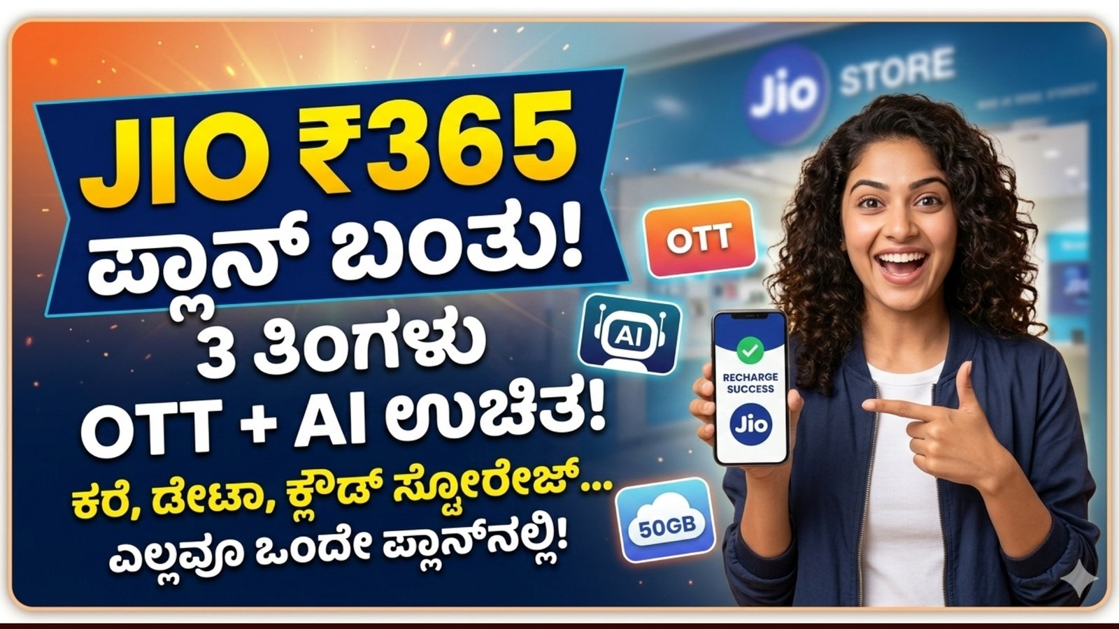 Jio ₹365 ರೀಚಾರ್ಜ್ ಮಾಡಿದರೆ 3 ತಿಂಗಳು OTT + AI ಸೌಲಭ್ಯ ಉಚಿತ! ಇಲ್ಲಿದೆ ಸಂಪೂರ್ಣ ಮಾಹಿತಿ