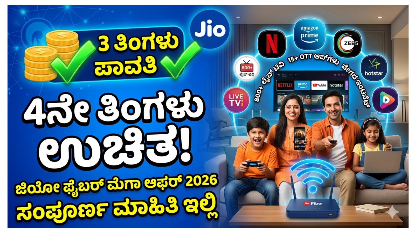 Jio ಜಿಯೋ ಫೈಬರ್ ಮೆಗಾ ಆಫರ್ 2026: 3 ತಿಂಗಳು ಪಾವತಿ ಮಾಡಿದರೆ 4ನೇ ತಿಂಗಳು ಉಚಿತ! ಸಂಪೂರ್ಣ ಮಾಹಿತಿ ಇಲ್ಲಿದೆ
