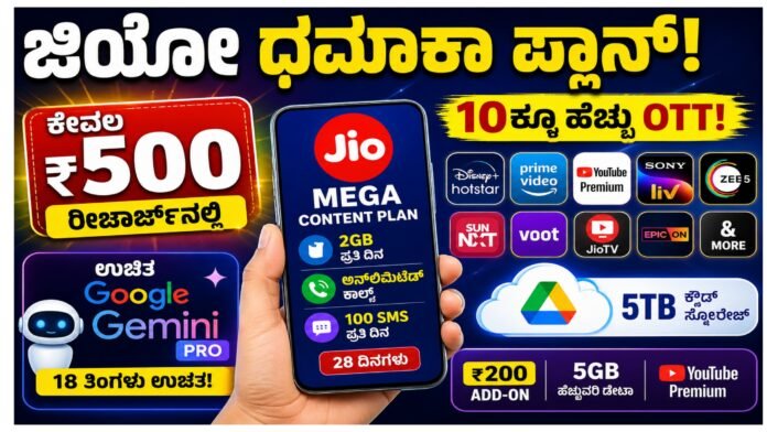 Jio ಜಿಯೋ ಮೆಗಾ ಆಫರ್ 2026: ₹500 ರೀಚಾರ್ಜ್ನಲ್ಲಿ ಡೇಟಾ, OTT, AI—all-in-one ಪ್ಲಾನ್!
