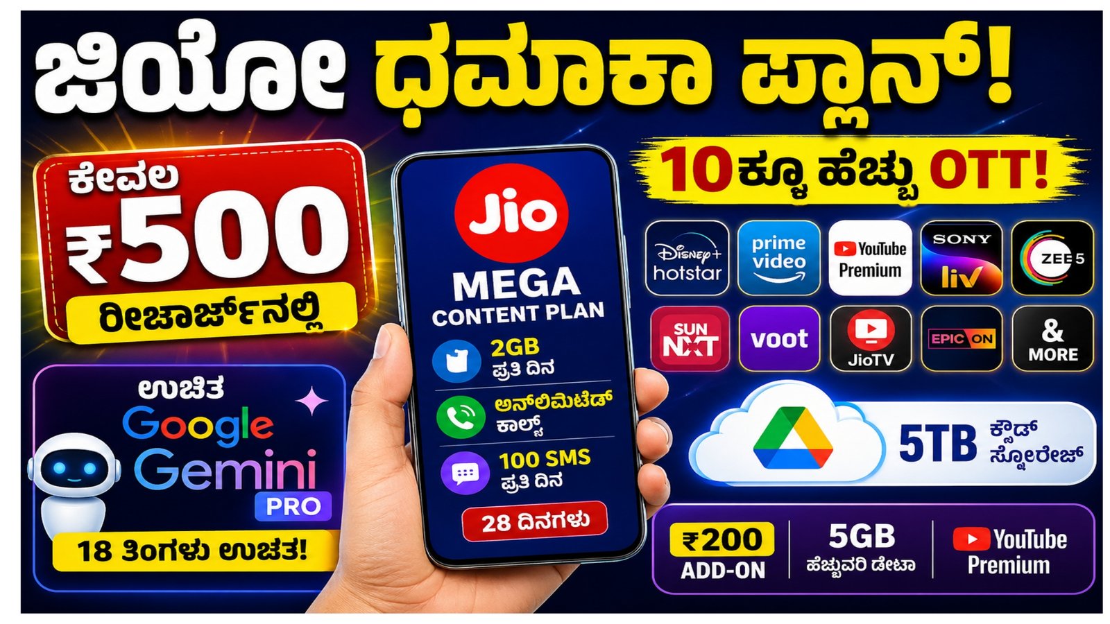 Jio ಭಾರತದಲ್ಲಿ ಡಿಜಿಟಲ್ ಸೇವೆಗಳ ಬಳಕೆ ದಿನೇದಿನೇ ಹೆಚ್ಚುತ್ತಿರುವ ಈ ಸಮಯದಲ್ಲಿ, ಟೆಲಿಕಾಂ ಕಂಪನಿಗಳು ಕೇವಲ ಕರೆ ಮತ್ತು ಡೇಟಾ ಮಾತ್ರವಲ್ಲ, ಸಂಪೂರ್ಣ ಡಿಜಿಟಲ್ ಅನುಭವವನ್ನು ಒದಗಿಸುವತ್ತ ಗಮನ ಹರಿಸುತ್ತಿವೆ. ಇದೇ ಹಿನ್ನೆಲೆದಲ್ಲಿ Reliance Jio ತನ್ನ ಹೊಸ “ಮೆಗಾ ಕಂಟೆಂಟ್ ಪ್ಲಾನ್” ಅನ್ನು ಪರಿಚಯಿಸಿದ್ದು, ಕಡಿಮೆ ಬೆಲೆಯಲ್ಲಿ ಹೆಚ್ಚಿನ ಸೌಲಭ್ಯಗಳನ್ನು ನೀಡುವ ಮೂಲಕ ಮತ್ತೆ ಗಮನ ಸೆಳೆದಿದೆ.