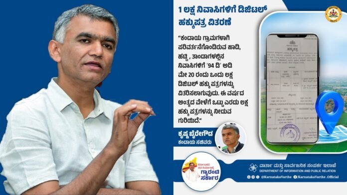 ಕರ್ನಾಟಕದ ಗ್ರಾಮೀಣ ಭಾಗದಲ್ಲಿ ನೆಲೆಸಿರುವ ರೈತರಿಗೆ ಭೂಮಿಯ ಮಾಲೀಕತ್ವವನ್ನು ಕಾನೂನುಬದ್ಧವಾಗಿ ದೃಢೀಕರಿಸಲು ಕಂದಾಯ ಇಲಾಖೆ ಮಹತ್ವಪೂರ್ಣ ಹೆಜ್ಜೆ ಹೂಡಿದೆ. 2025ರ ಮೇ 20ರಂದು, ’94 ಡಿ’ ಯೋಜನೆಯಡಿಯಲ್ಲಿ, ಹಾಡಿ, ಹಟ್ಟಿ, ಹಾಗೂ ತಾಂಡಾ ಗ್ರಾಮಗಳಲ್ಲಿ रहनेವರೆಗೂ 1 ಲಕ್ಷ ಡಿಜಿಟಲ್ ಹಕ್ಕುಪತ್ರಗಳನ್ನು ನೀಡಲಾಗುವುದು.