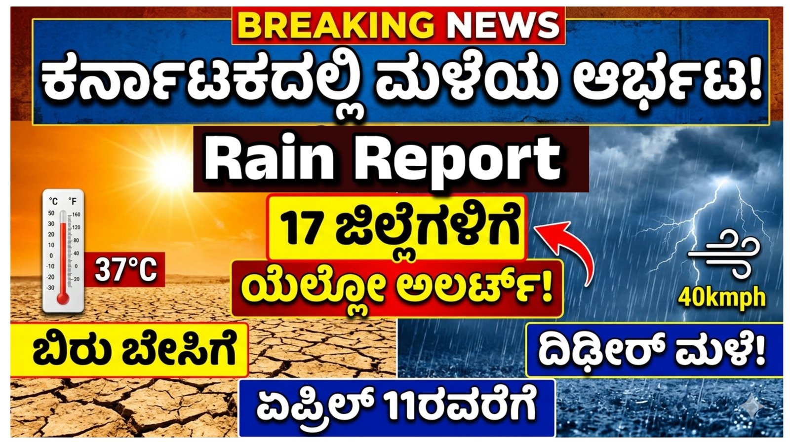 Rain ಕರ್ನಾಟಕದಲ್ಲಿ ಈ ಬಾರಿ ಬೇಸಿಗೆ ತಾಪಮಾನ ದಿನದಿಂದ ದಿನಕ್ಕೆ ಹೆಚ್ಚಾಗುತ್ತಿದ್ದು, ಜನರು ಉರಿಯುತ್ತಿರುವ ಬಿಸಿಲಿನಿಂದ ಸಂಕಷ್ಟ ಅನುಭವಿಸುತ್ತಿದ್ದಾರೆ. ಆದರೆ ಈಗ ಹವಾಮಾನದಲ್ಲಿ ದೊಡ್ಡ ಬದಲಾವಣೆ ಕಾಣಿಸಿಕೊಂಡಿದ್ದು, ತಕ್ಷಣದ ಮಳೆಯ ಮೂಲಕ ಸ್ವಲ್ಪ ಮಟ್ಟಿಗೆ ತಂಪು ದೊರೆಯುವ ನಿರೀಕ್ಷೆ ಮೂಡಿದೆ. ಹವಾಮಾನ ಇಲಾಖೆ ನೀಡಿರುವ తాజಾ ವರದಿಯ ಪ್ರಕಾರ, ಏಪ್ರಿಲ್ 11ರವರೆಗೆ ರಾಜ್ಯದ ಹಲವೆಡೆ ಮಳೆಯಾಗುವ ಸಾಧ್ಯತೆ ಇದೆ. ಇದರ ಜೊತೆಗೆ 17 ಜಿಲ್ಲೆಗಳಿಗೆ ಯೆಲ್ಲೋ ಅಲರ್ಟ್ ಘೋಷಿಸಲಾಗಿದೆ.