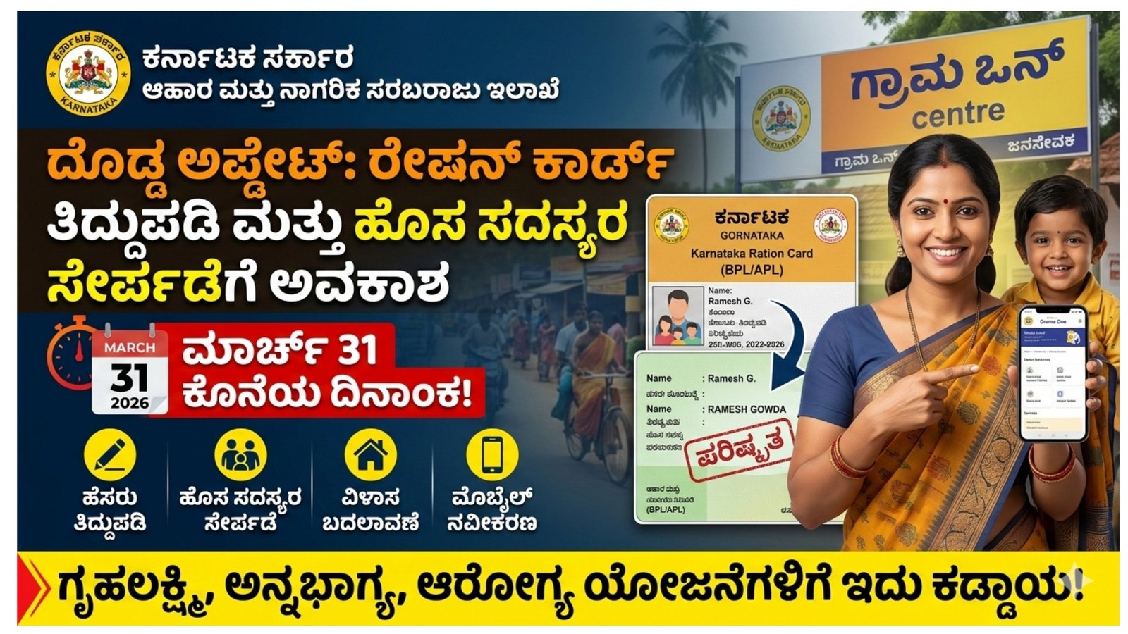 ಆದರೆ ಗಮನದಲ್ಲಿಡಬೇಕಾದ ಮುಖ್ಯ ವಿಷಯವೆಂದರೆ ಈ ತಿದ್ದುಪಡಿ ಹಾಗೂ ಹೊಸ ಹೆಸರು ಸೇರ್ಪಡೆಗೆ ಮಾರ್ಚ್ 31, 2026 ಕೊನೆಯ ದಿನಾಂಕವಾಗಿದೆ. ಈ ದಿನಾಂಕದೊಳಗೆ ಅರ್ಜಿ ಸಲ್ಲಿಸಿದರೆ ಮಾತ್ರ ನಿಮ್ಮ ರೇಷನ್ ಕಾರ್ಡ್‌ನಲ್ಲಿ ಬದಲಾವಣೆ ಮಾಡಿಸಿಕೊಳ್ಳಲು ಸಾಧ್ಯವಾಗುತ್ತದೆ.