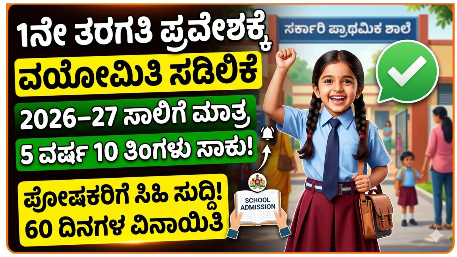2026–27ನೇ ಶೈಕ್ಷಣಿಕ ಸಾಲಿಗೆ ಮಾತ್ರ ಅನ್ವಯವಾಗುವಂತೆ ಮಕ್ಕಳ 1ನೇ ತರಗತಿ ಪ್ರವೇಶ ವಯೋಮಿತಿಯಲ್ಲಿ 60 ದಿನಗಳ ಸಡಿಲಿಕೆ ನೀಡಲಾಗಿದೆ. ಈ ನಿರ್ಧಾರವು ಲಕ್ಷಾಂತರ ಕುಟುಂಬಗಳಿಗೆ ದೊಡ್ಡ ಸಹಾಯವಾಗಿದೆ.